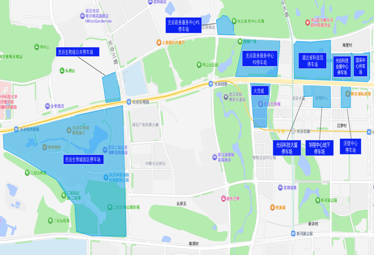 ①雄楚高架、高新二路方向自驾车辆,可选择光谷生物城园区停车场(4700个停车位)停放;