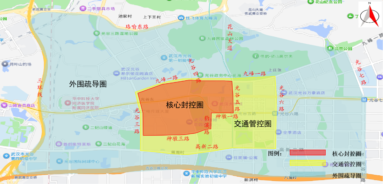 活动期间高新大道光谷三路路口北进口、西进口只允许车辆右转,禁止车辆左转或直行。