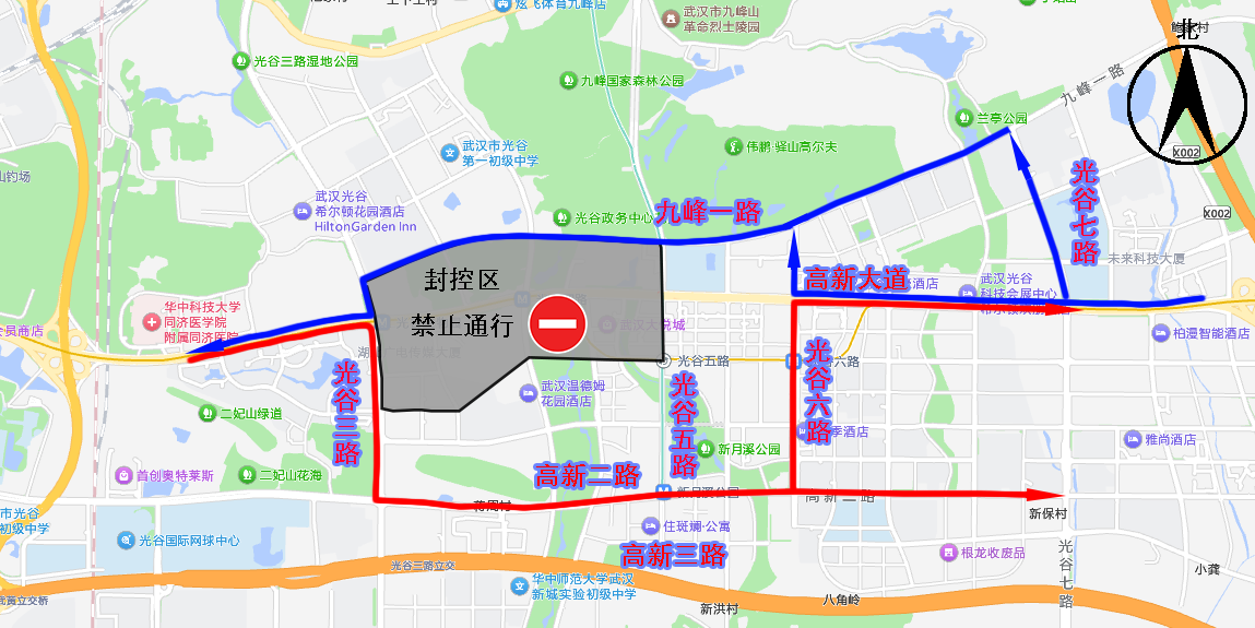 (2)高新大道东向西车辆绕行建议:光谷七路、光谷六路、九峰一路、光谷三路