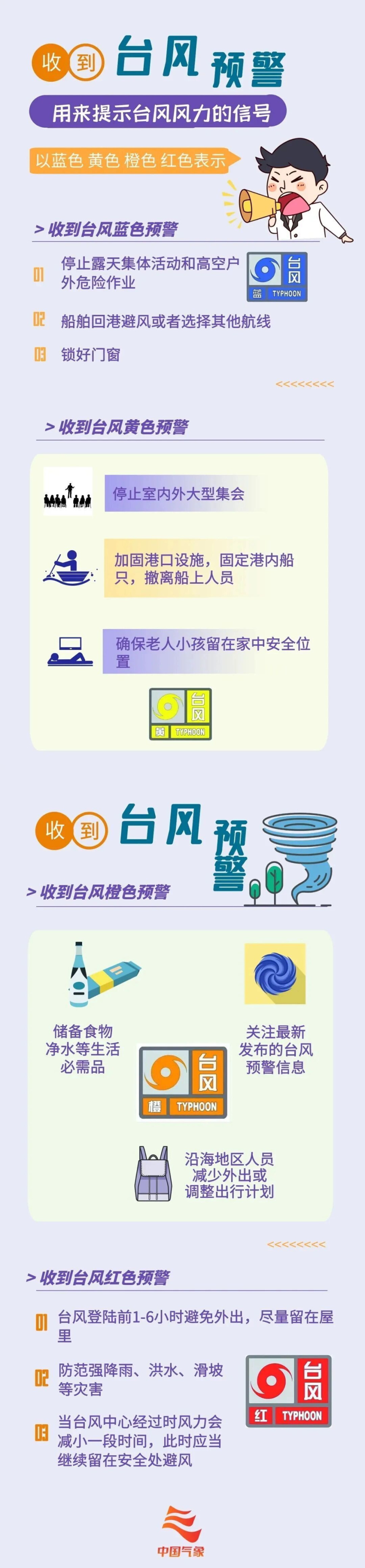 中央气象台发布的台风预警分为四级:台风蓝色、黄色、橙色与红色预警,预警颜色由浅到深,代表影响程度和防御等级越来越高。