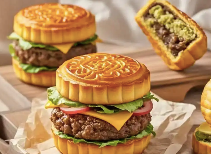 最近,有“脑洞大开”的网友将一个圆滚滚的小汉堡塞入月饼模具,压出了一个和传统月饼外形几乎一模一样的“汉堡月饼”:与广式月饼相似的棕黄色的表面上是熟悉无比的花纹,中间还有“中秋”两字,如果不看边缘溢出来的牛肉和酱料,那俨然就是一个老式“月饼”。