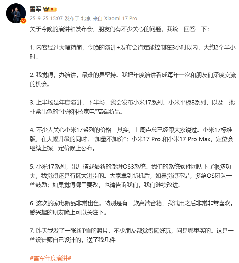 9月25日,雷军发微博回应关于今晚演讲和发布会的相关问题,全文如下: