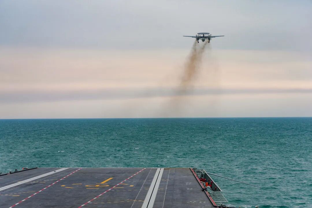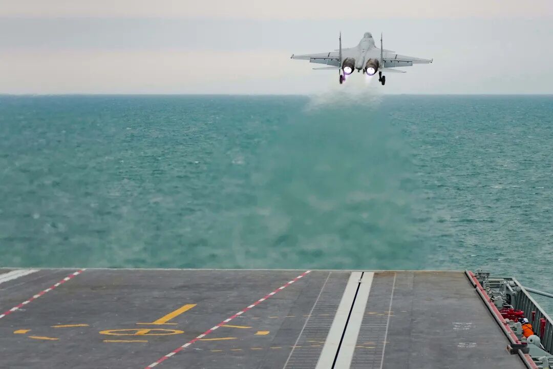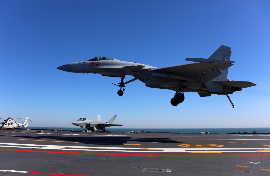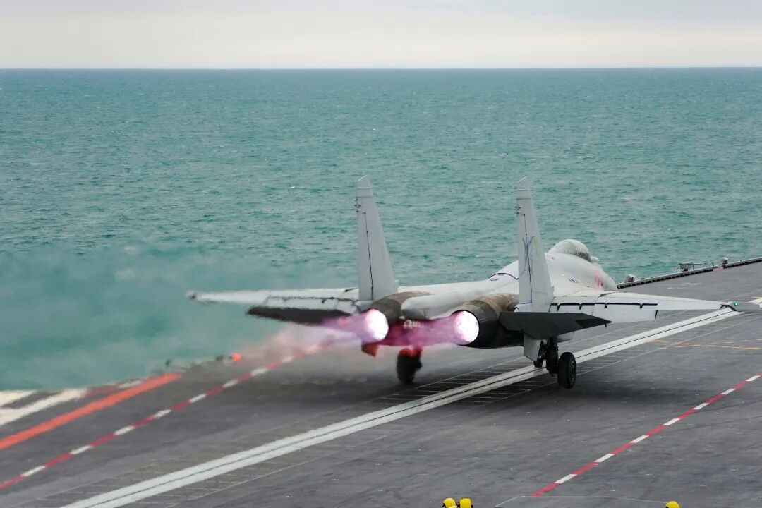 歼-35舰载战斗机在海军福建舰开展触舰复飞训练。李唐 摄