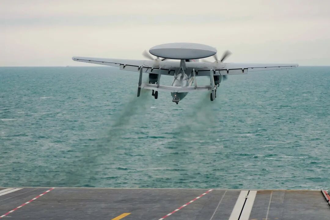 空警-600舰载预警机在海军福建舰阻拦着舰。图为飞机放下尾钩的着舰前瞬间。岳书华 摄