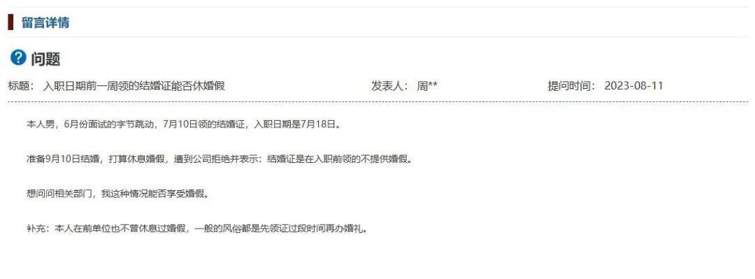 无独有偶,天津一网友入职前一周领证请婚假被拒,人社局也明确回应其符合休假条件。