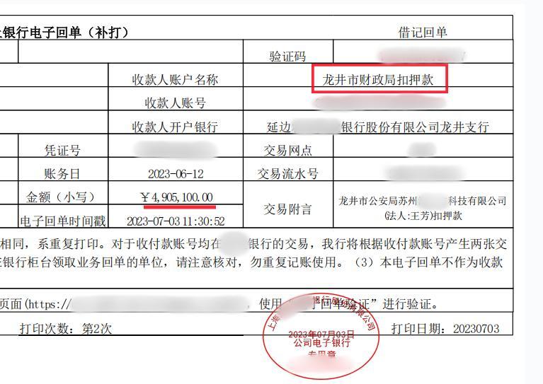 知情人给记者提供的一份某银行的电子回单显示,2023年6月12日下午3:34,相关关联公司一笔490余万元的款项被划走,收款人账户名称为“龙井市财政局扣押款”。此外,记者发现,相关证据显示,多笔扣押款的收款账户均是龙井市财政局。