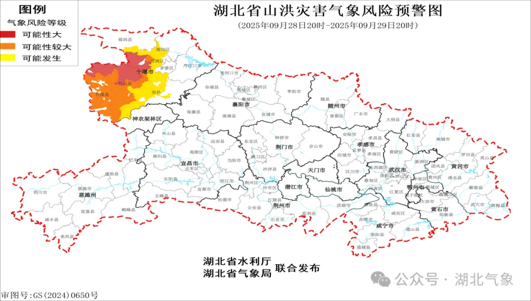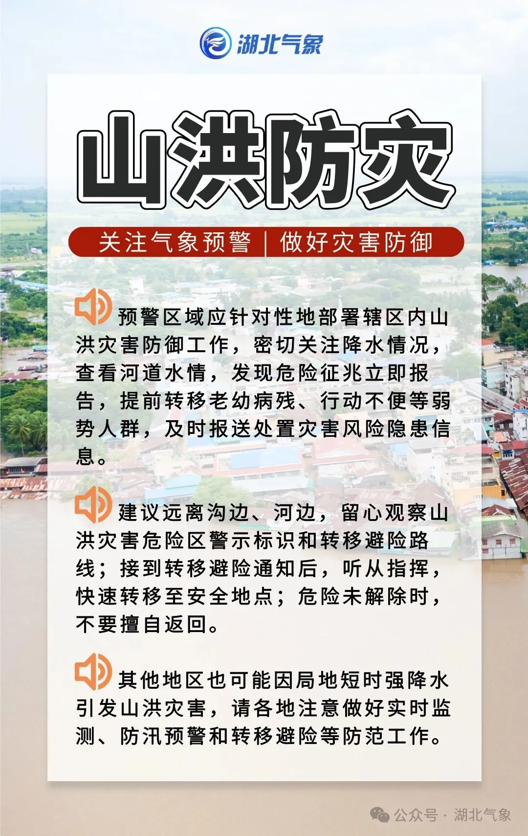 红色预警区域(山洪灾害可能性大):十堰市(竹溪县、郧阳区、竹山县)。橙色预警区域(山洪灾害可能性较大):十堰市(张湾区、房县)黄色预警区域(山洪灾害可能发生):十堰市(茅箭区、郧西县)。