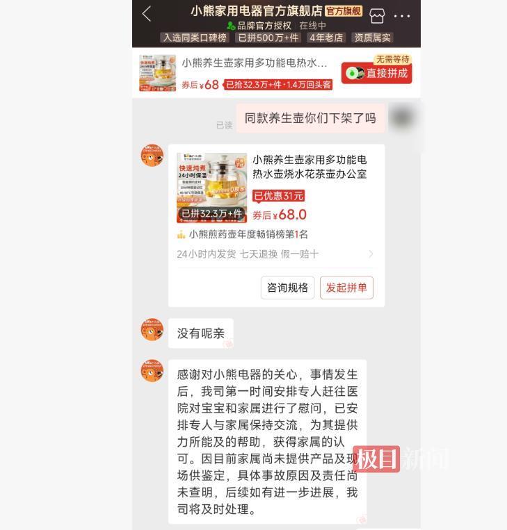 针对王女士孩子受伤一事,极目新闻记者也向拼多多平台上的“小熊家用电器官方旗舰店”咨询,客服人员回复称,事情发生后,公司第一时间安排专人赶往医院对宝宝和家属进行了慰问,已安排专人与家属保持交流,为其提供力所能及的帮助,获得家属的认可。因目前家属尚未提供产品及现场供鉴定,具体事故原因及责任尚未查明,后续如有进一步进展,公司将及时处理。