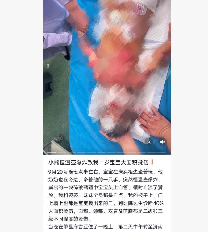 9月25日、27日,王女士在网上接连发文称,当时养生壶崩出的碎玻璃砸中孩子头部,到医院诊断,孩子40%面积烫伤,面部、颈部、双肩及前胸都是二级和三级不同程度的烫伤。24日,孩子已在济南做完手术,后续还需要植皮修复疤痕。26日,小熊电器方面有人与她当面沟通,并承诺会再探望孩子进行下一步处理。