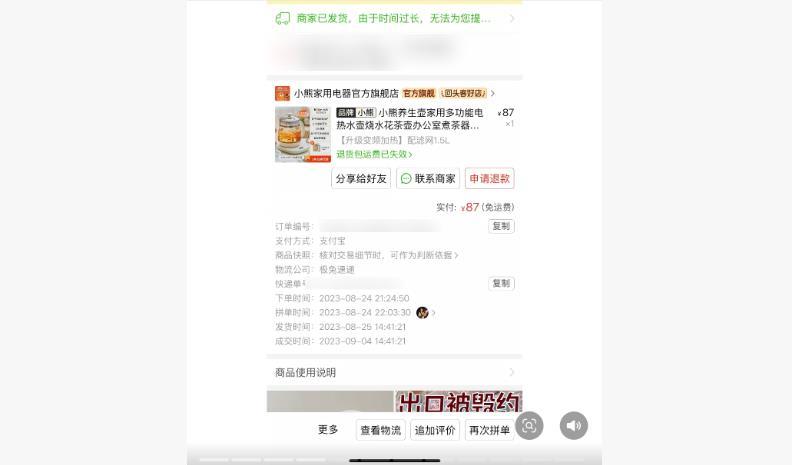 王女士公布的订单信息显示,她是在拼多多平台“小熊家用电器官方旗舰店”购买的该款养生壶,下单时间为2023年8月24日。