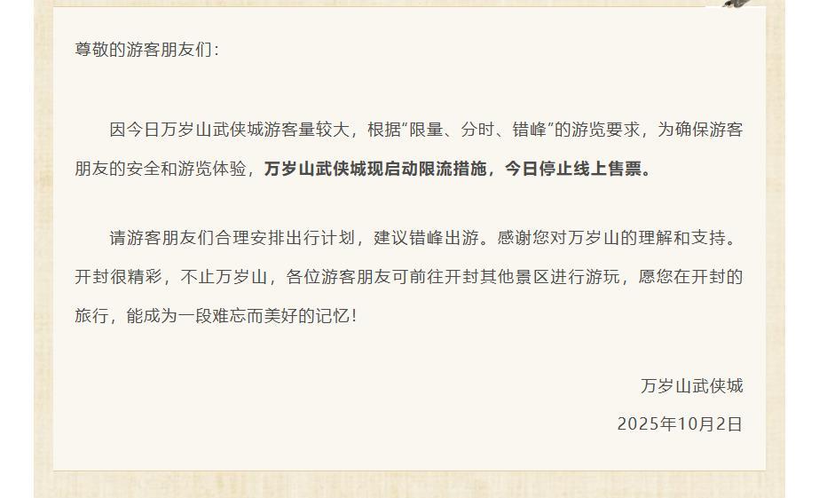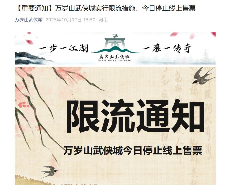 上述通知提到,因10月2日万岁山武侠城游客量较大,根据“限量、分时、错峰”的游览要求,为确保游客朋友的安全和游览体验,万岁山武侠城现启动限流措施,今日停止线上售票。
