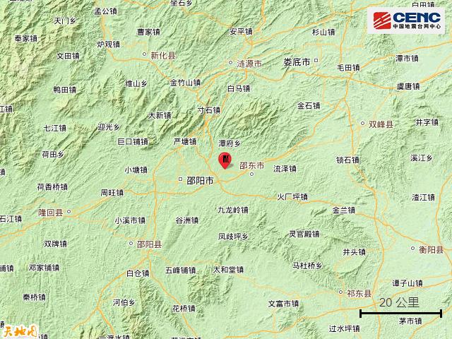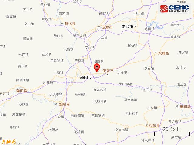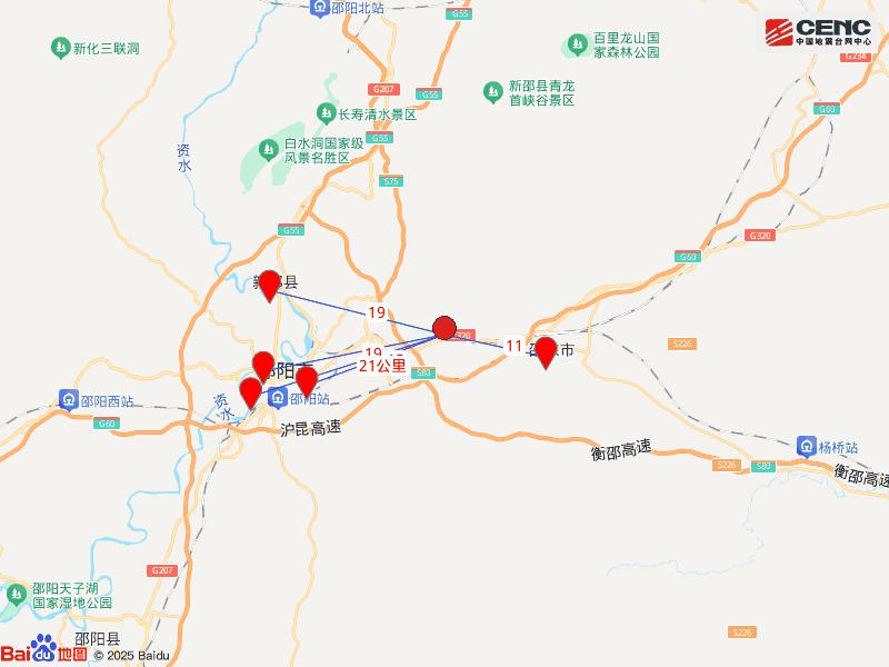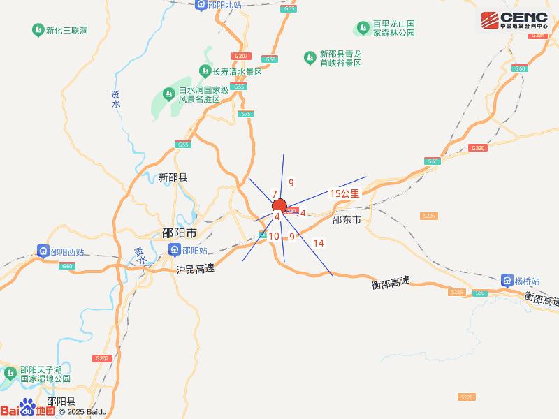 震中距邵东市11公里、距双清区15公里、距北塔区19公里、距新邵县19公里、距大祥区21公里,距邵阳市18公里,距长沙市162公里。