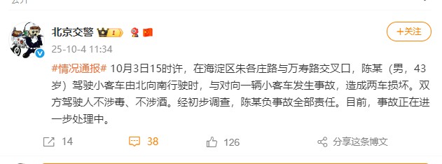 10月4日11:34,@北京交警发布情况通报:10月3日15时许,在海淀区朱各庄路与万寿路交叉口,陈某(男,43岁)驾驶小客车由北向南行驶时,与对向一辆小客车发生事故,造成两车损坏。双方驾驶人不涉毒、不涉酒。经初步调查,陈某负事故全部责任。目前,事故正在进一步处理中。