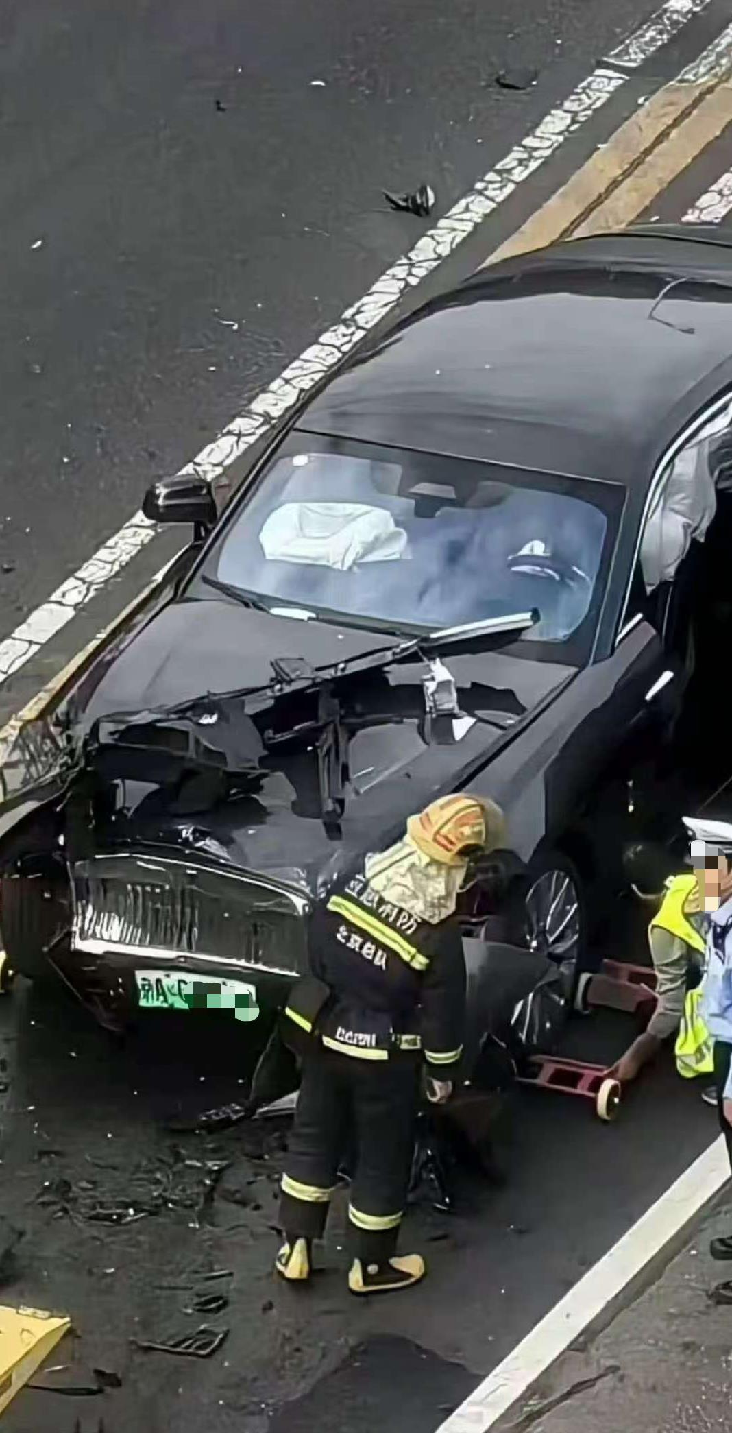 网传照片显示,一辆劳斯莱斯闪灵轿车停在公路上,车身损毁严重,安全气囊弹出。车外人员疑似知名车评人陈震。记者对比该车的车牌号,与此前媒体曝光的车评人陈震的车辆为同一号牌。有网友称,该事故发生在北京万寿路。