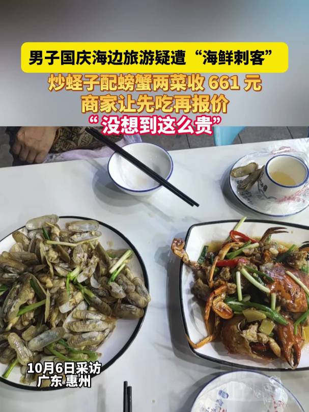 据媒体此前报道,10月6日,有网友在社交平台发文,国庆到广东惠州旅游,在一海边餐厅吃饭时,点了炒蛏子和螃蟹两个菜总价661元,怀疑自己遇到“海鲜刺客”。