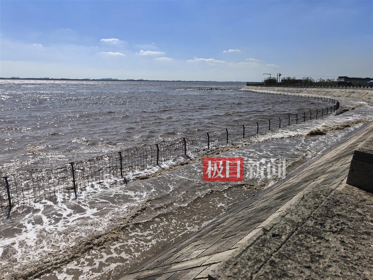 10月9日10时许,极目新闻记者在海宁大缺口观潮点看到,距离大潮预测到来时间还有3小时,气温接近30摄氏度,但江堤的防护栏边已几乎围满了游客,还有大量游客在不远处的阴凉处等候。12时39分前后,一波较小的潮水伴着轰隆隆的声响,呈一条白线状滚滚向前冲到岸边,围观人群中不时传出惊呼,有人称声音听起来像山洪袭来。12时50分前后,大潮抵达,持续拍打着堤岸,并冲上沿江堤坝,再次吸引人群围观。