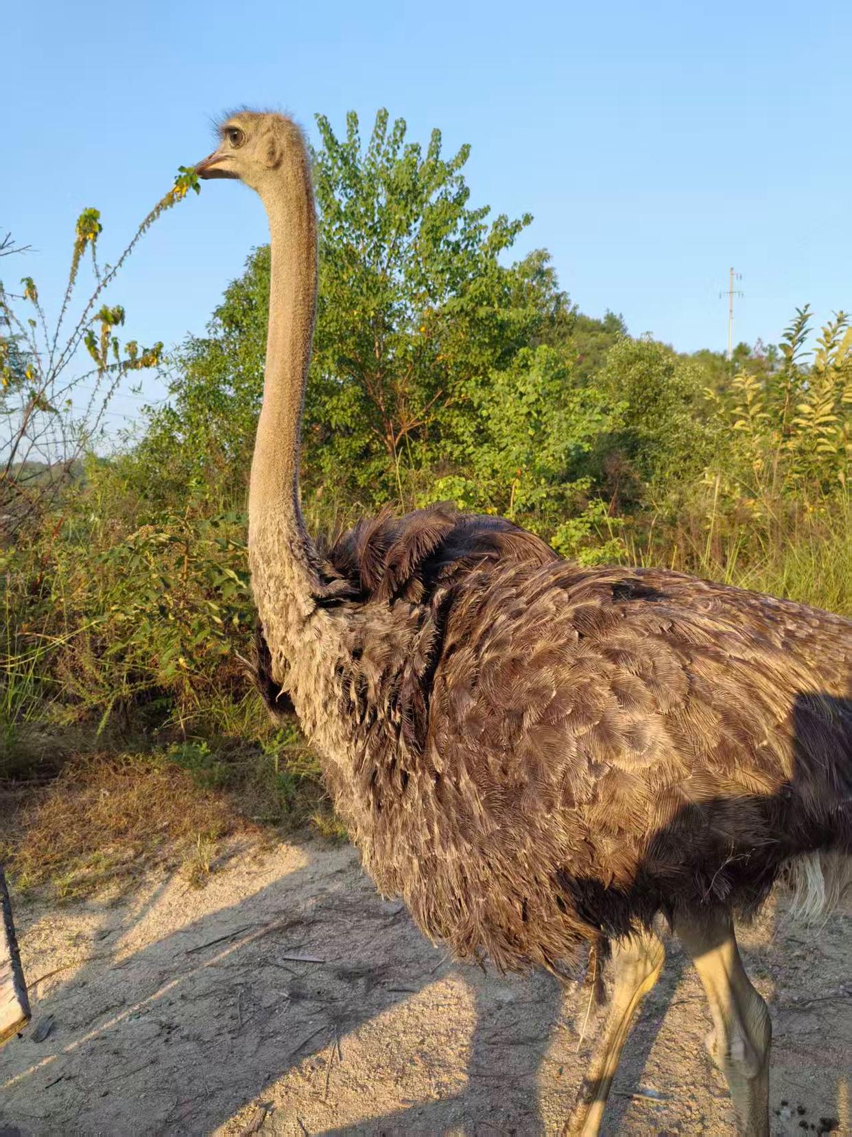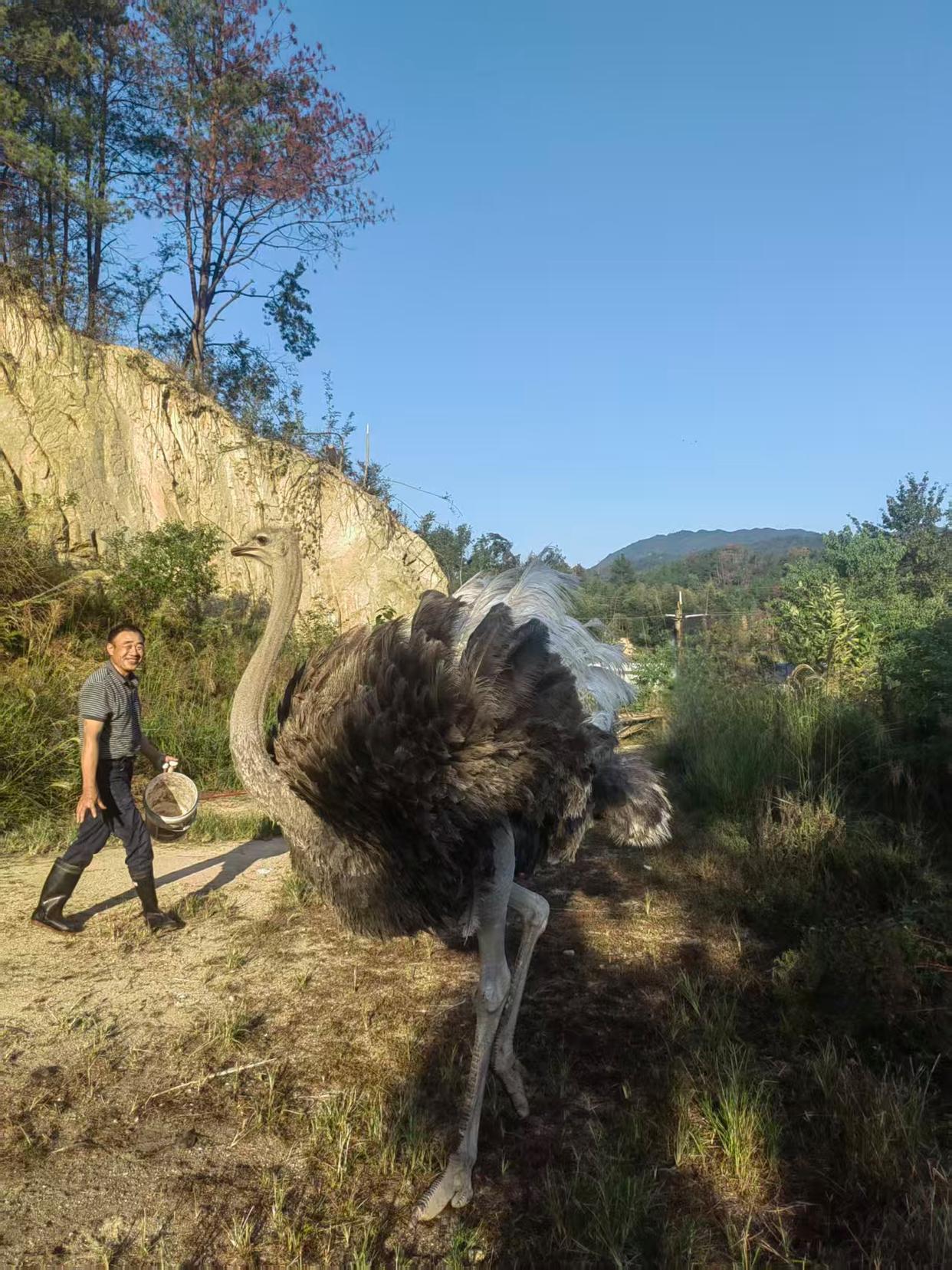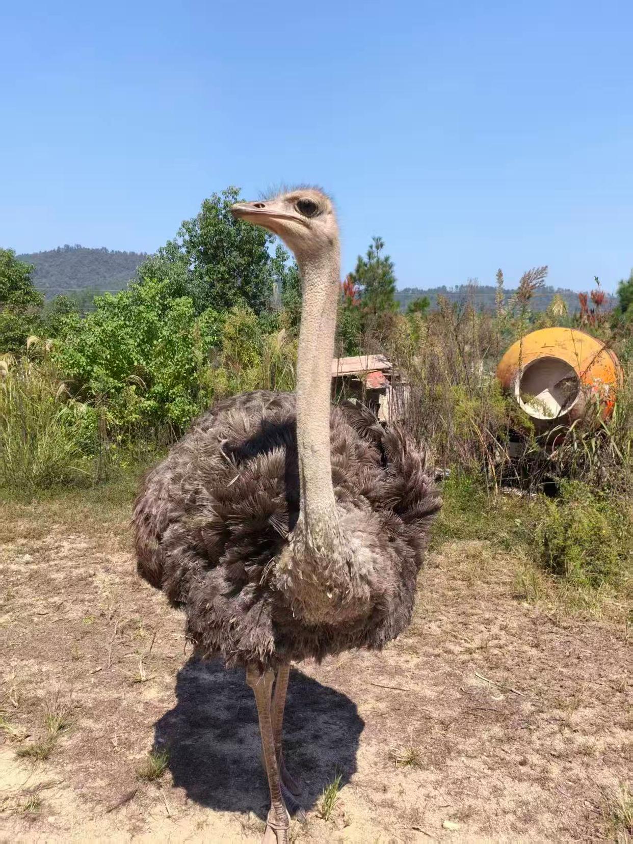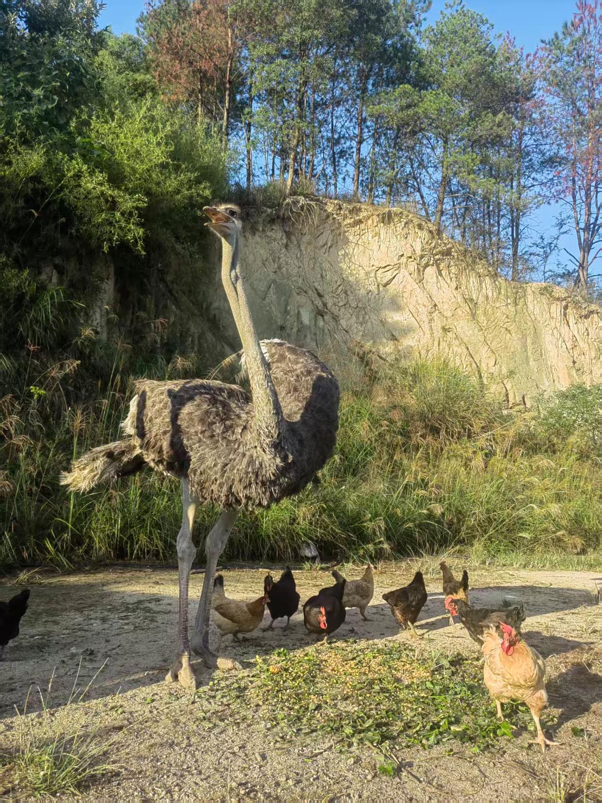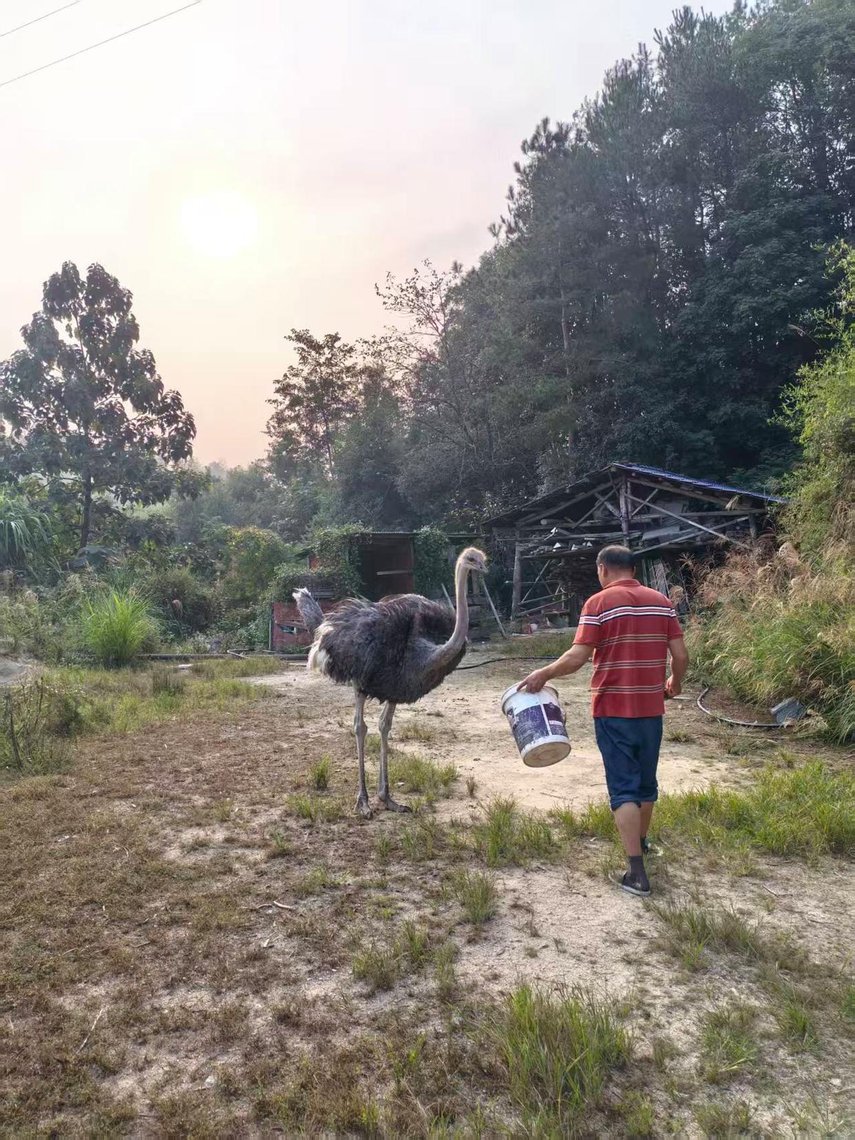 何女士老家在长沙宁乡的农村,家里还养了鸡鸭等家禽,当时爸爸的朋友中也有人买鸵鸟来养。下单三只幼鸵后,售卖的养殖场将三只鸵鸟送到约定地方,何女士与家人开车去接。“当时三只鸵鸟刚出生两个月,体型和成年公鸡差不多”,接回三只鸵鸟后,何女士家人将它们饲养在农村后山的空地,与鸡鸭共同生活。