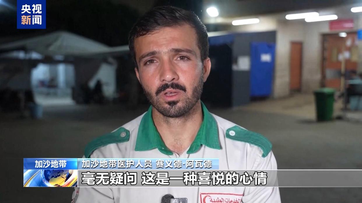 加沙地带医护人员 赛义德·阿瓦德:毫无疑问,这是一种喜悦的心情。我们已经深陷这场战争,承受这份苦难两年了。一听到这个消息,我们都不敢相信,因为实在太开心了,还得找人确认消息真伪。现在我们就等协议生效,好让这场战争、这份苦难还有加沙的种族清洗彻底结束。