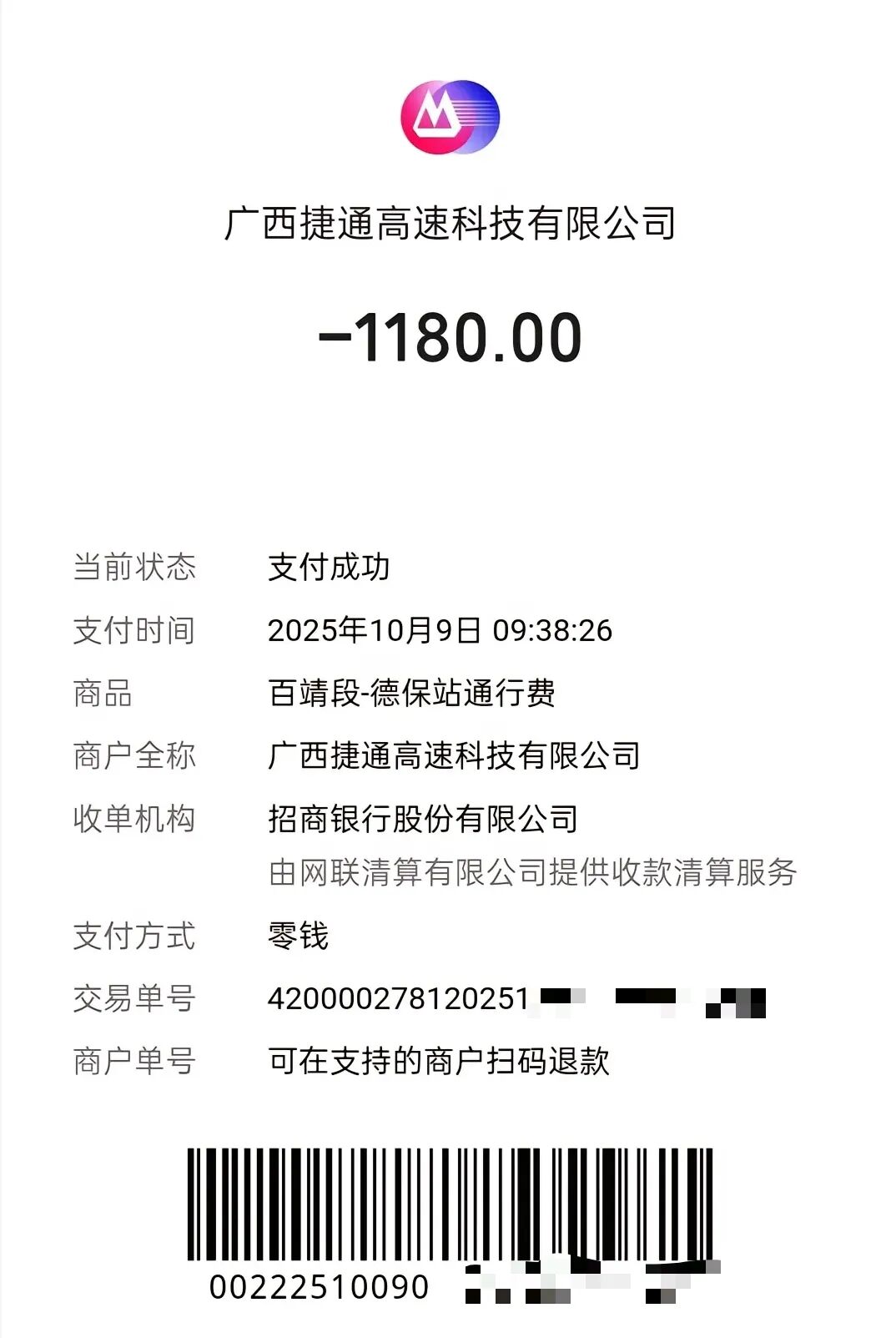 10月9日下午2时许,公益达人胡雷在社交平台发声:“抗洪救灾应急物资我报备了,全中国只要报备的物资,都是免高速路费,这是我们国家规定的事,为什么到了你们这地方就没有呢?”胡雷出示的收费截图显示,百靖段-德保站通行费1180元,收款方为广西捷通高速科技有限公司。