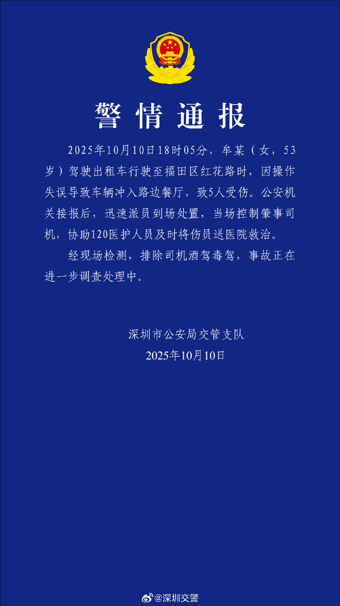 深圳市公安局交管支队通报,10月10日18时05分,牟某(女,53岁)驾驶出租车行驶至福田区红花路时,因操作失误导致车辆冲入路边餐厅,致5人受伤。公安机关接报后,迅速派员到场处置,当场控制肇事司机,协助120医护人员及时将伤员送医院救治。