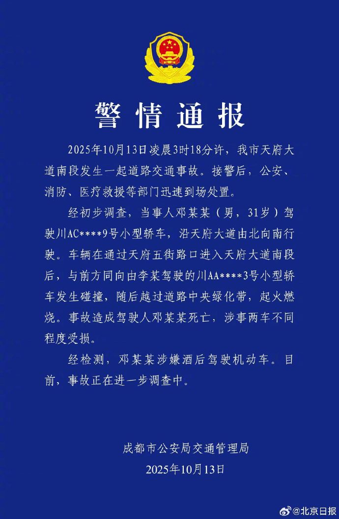 成都市公安局交通管理局10月13日通报:2025年10月13日凌晨3时18分许,我市天府大道南段发生一起道路交通事故。接警后,公安消防、医疗救援等部门迅速到场处置。