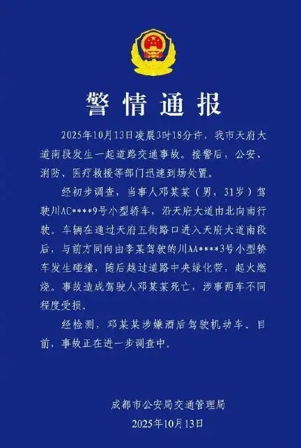 2025年10月13日凌晨3时18分许,成都市天府大道南段发生一起道路交通事故。接警后,公安、消防、医疗救援等部门迅速到场处置。
