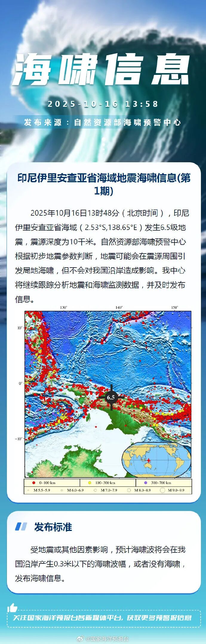 国家海洋预报台发布地震海啸信息:2025年10月16日13时48分(北京时间),印尼伊里安查亚省海域(2.53°S,138.65°E)发生6.5级地震,震源深度为10千米。自然资源部海啸预警中心根据初步地震参数判断,地震可能会在震源周围引发局地海啸,但不会对我国沿岸造成影响。我中心将继续跟踪分析地震和海啸监测数据,并及时发布信息。