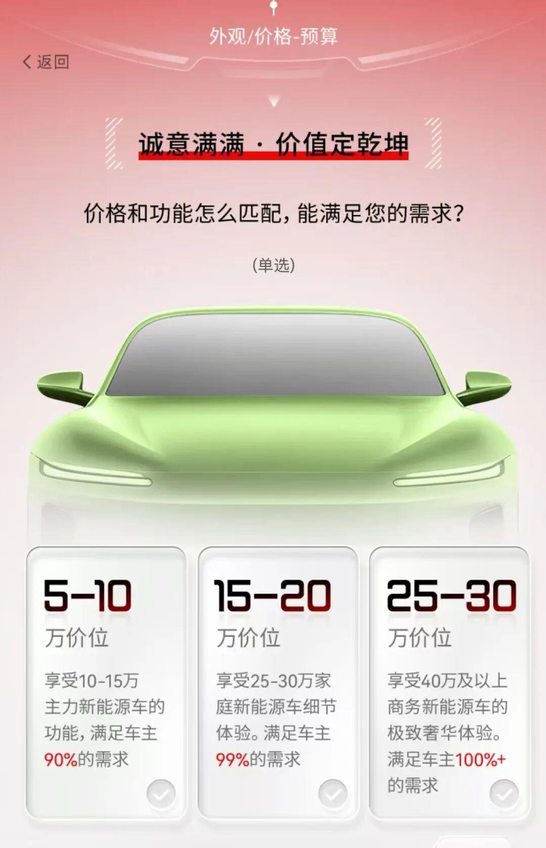 目前,在京东App的汽车板块已上线“国民好车”定制互动页面,用户可从安全、性能、电池、服务、价格外观等多维度参与互动,目前已吸引近17万名用户参与。页面信息显示,该车为5座小型轿车,续航里程在401—600公里之间,提供了5万—10万元、15万—20万元、25万—30万元三个价位的选择。