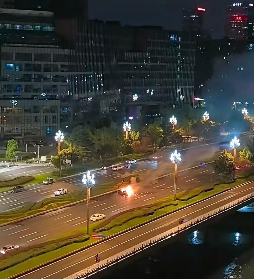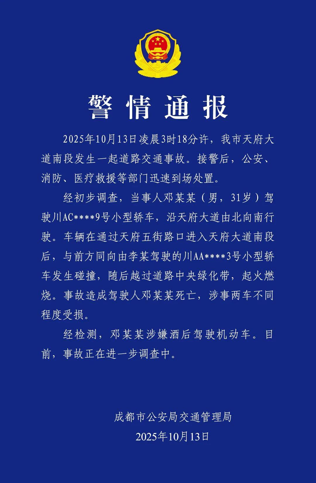 据警方的通报显示,10月13日凌晨3时18分许,当事人邓某某(男,31岁)驾驶小型轿车,沿天府大道由北向南行驶。车辆在通过天府五街路口进入天府大道南段后,与前方同向由李某驾驶的小型轿车发生碰撞,随后越过道路中央绿化带,起火燃烧。