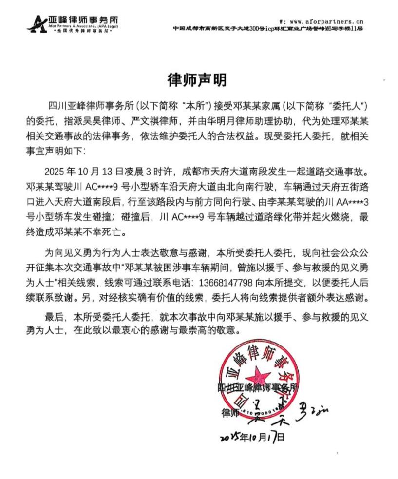 10月17日深夜,四川亚峰天府律师事务所在其官方微信公众号发布律师声明,称接到10月13日凌晨成都天府大道新能源汽车事故中死者邓某某家属的委托,向社会公众公开征集在事故中曾施以援手、参加救援的见义勇为人士的相关线索。