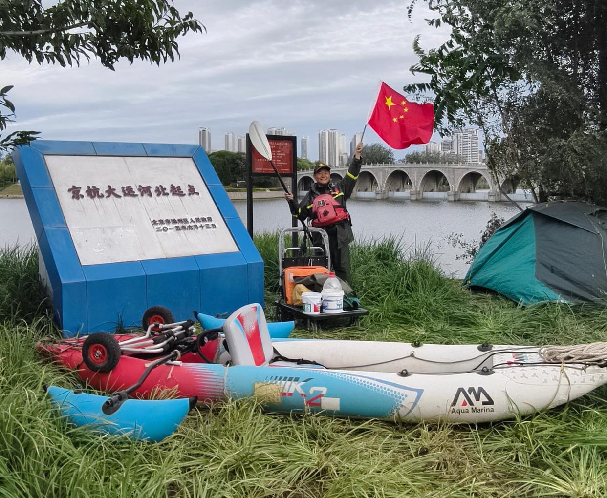 “我们到北京了!”10月17日,吴晓亮终于抵达京杭大运河北起点,他一边挥舞着国旗,一边大声欢呼。在他背后,是标志性的北关拦河闸桥。