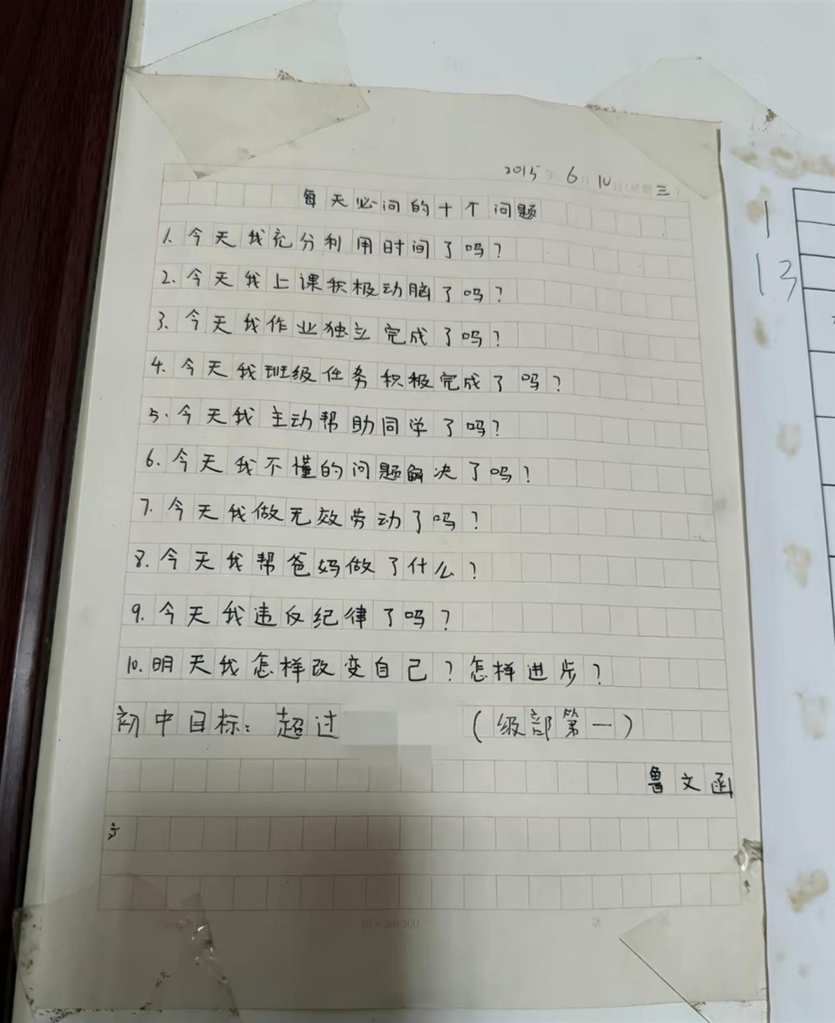 “当时我很害怕,以为会被他臭骂一顿,没想到苗老师没有责罚我,而是跟我聊了一中午。”鲁文函说,多年前的那个中午,很多细节他都淡忘了,但有两点他记得清清楚楚。当时,苗老师向他展示了自己随身携带多年的笔记本,打开后第一页就写着“每天必问的10个问题”。苗老师说,他教了20多年书,每带一届学生,都会向他们提到这10个问题,让学生们每天都叩问自己,做到严于律己,努力拼搏成为国家的栋梁。苗老师让鲁文函将这10个问题誊抄下来,回家贴在书桌旁边,每天都看几遍,对人生会有很大的帮助。