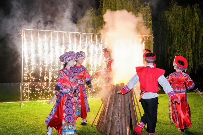 晚8点,随着一声悠长的口令,主舞台中央的“电子篝火台”瞬间燃起橘红色的“蒸汽火焰”,跃动的火光如金蛇狂舞,篝火晚会正式开启。餐厅湖畔广场上,篝火熊熊燃起,土家族艺人身着传统服饰,带领宾客跳起摆手舞。随着鼓点节奏,众人手拉手围成圆圈,舞步由缓至急,现场气氛逐渐升温。