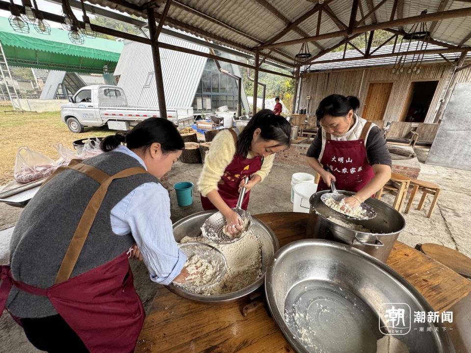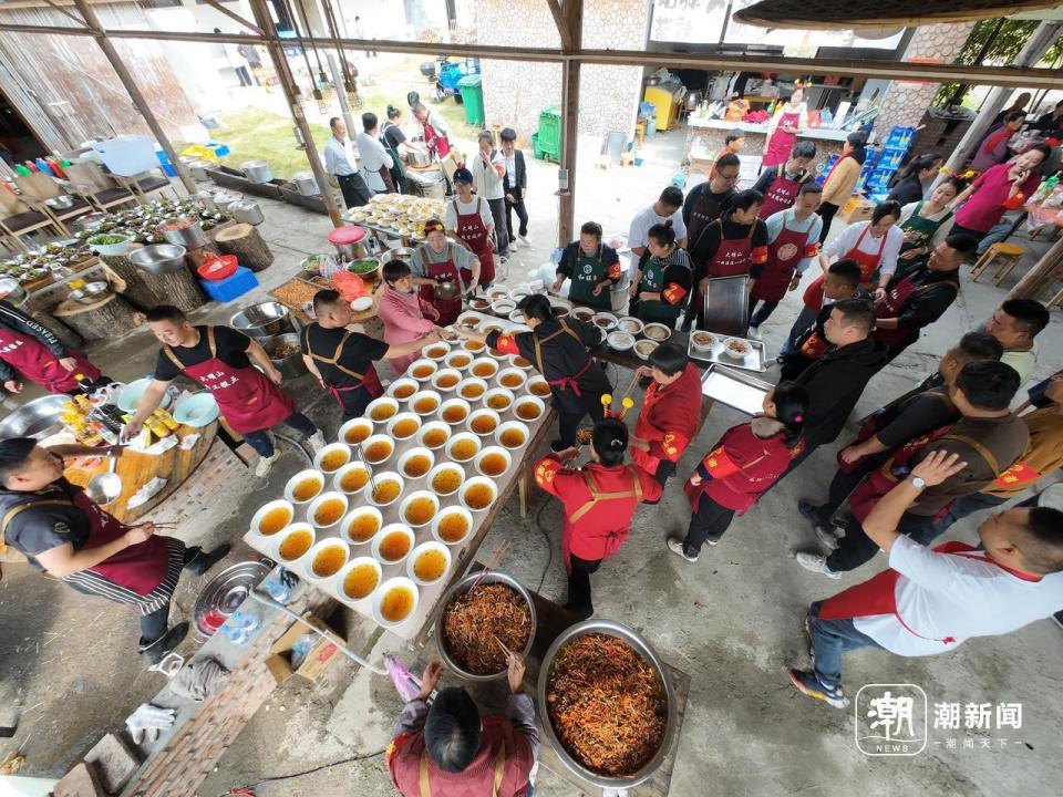 小苏穿梭在厨房和广场之间,一会儿对接送菜师傅,一会儿指挥横幅摆放;民宿老板娘们系着围裙,弯腰洗碗,切菜,还有的正凑在一起搓豆腐肉圆;男士们则揽过搬菜、挂灯笼等体力活……个个干劲十足。