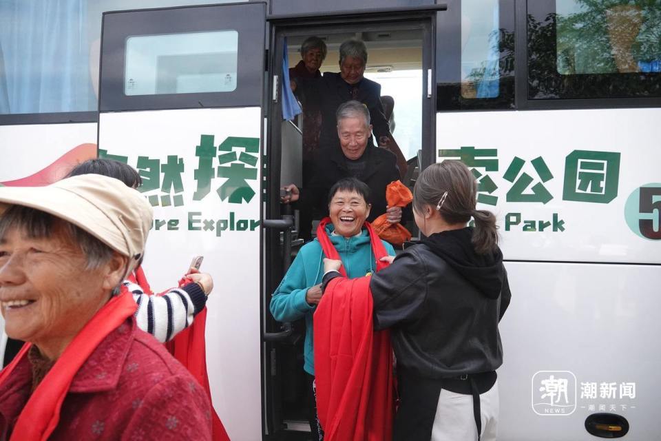 上午10点多,一辆辆接送老人的大巴车陆续抵达,年轻志愿者早已等候在路边。他们给老人戴上红色围巾。