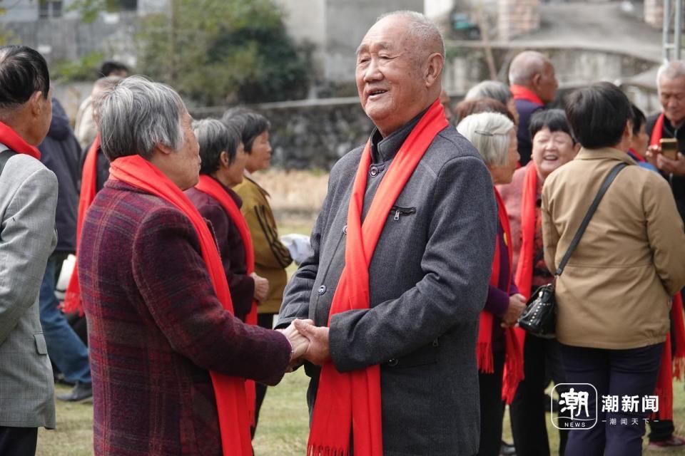 还有的老人在村宴现场和平时难得一见的亲戚团聚,激动地将双手握在一起。