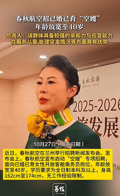 近日,春秋航空在兰州举行招聘新闻发布会。发布会上,春秋航空宣布启动“空嫂”专项招聘,面向已婚已育女性开放客舱乘务员岗位,年龄放宽至40岁,学历要求为全日制本科及以上,身高162cm至174cm,无工作经验限制。