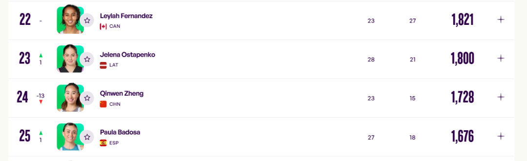 10月27日,WTA官方公布最新世界排名,在扣除了去年东京站夺冠的500分和总决赛的800分之后,郑钦文世界排名跌出前20。本周郑钦文以1728分,排名世界第24位。