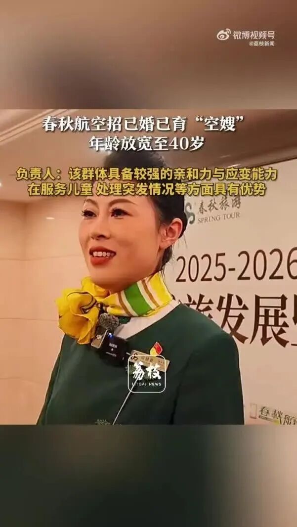 春秋航空发布的客舱乘务员(空嫂)兰州专项招聘计划显示,招聘面向已婚已育女性,年龄放宽至40岁。身高162cm~174cm,持全日制本科及以上学历,无工作经验要求、专业不限。