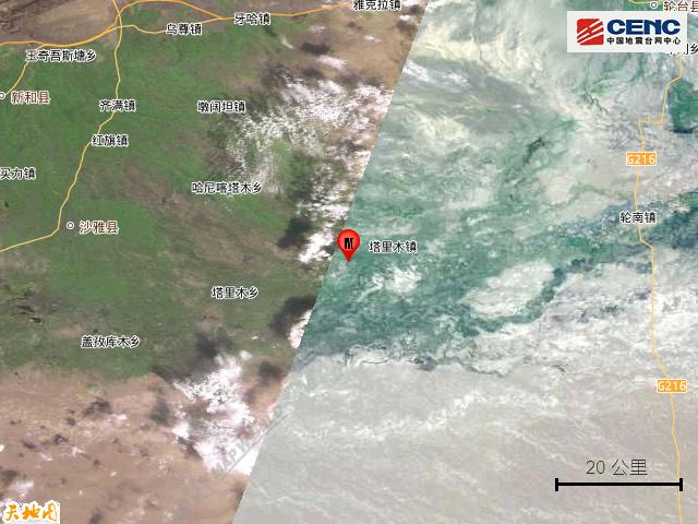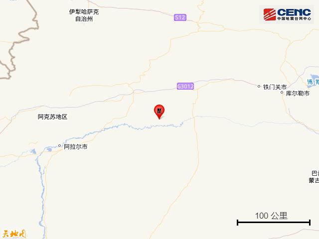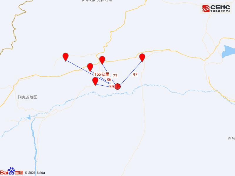 震中距沙雅县59公里、距库车市77公里、距新和县86公里、距轮台县97公里、距拜城县155公里,距阿拉尔市196公里,距阿克苏地区270公里,距乌鲁木齐市452公里。