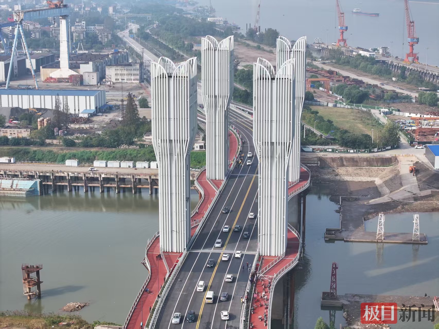 根据设计,该桥距离水面的通航净空高度为8米。“平日,它供车辆通行,桥下也可通过一般船舶;汛期来临和当青山船厂有通航运输需求时,重达2650吨的钢箱梁桥面能够在9分钟快速提升27米,让通航净空达到35米,确保5000吨级船舶正常通行。”这位负责人说。
