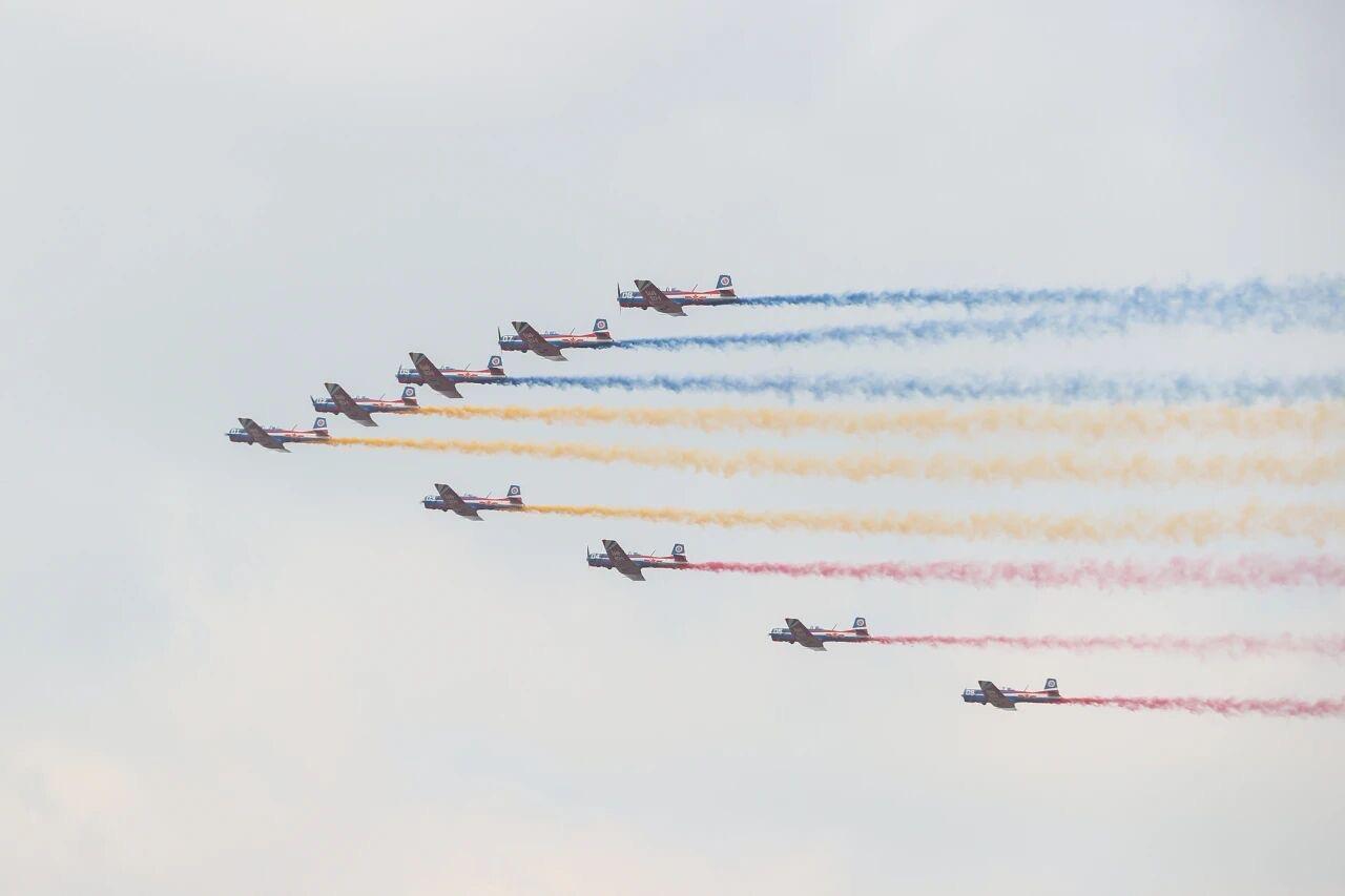 10月31日开幕式当天,最大亮点当属空军航空大学“天之翼”飞行表演队的首次亮相。公开报道显示,队员们驾驶初教-6型教练机,先后排出“威龙”“钻石”“鹰队”“雁队”等九机编队,在天空中划出整齐的轨迹。随后,“九机钻石”“七机开花”“四机菱形”“对头交叉”等硬核动作接连上演,尤其是压轴的“七机开花”。据央视报道,这个动作对飞行位置、时机和抗干扰能力要求极高,全靠队员们长期训练磨出的默契才能完成,引得现场掌声不断。