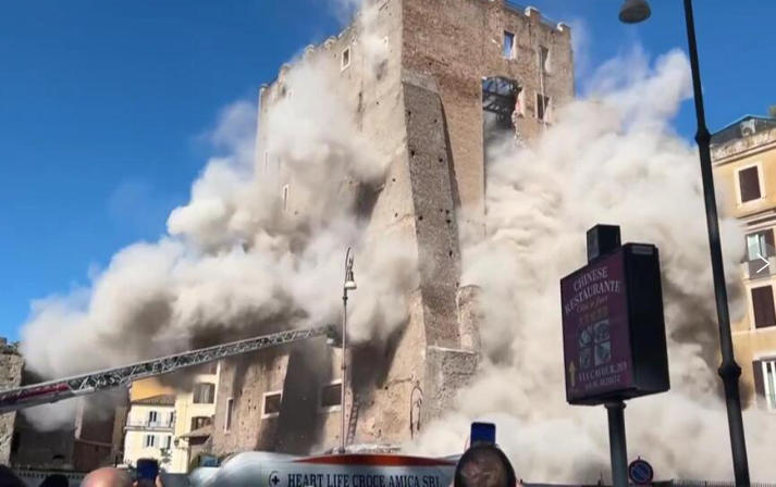 当地时间11月3日,意大利罗马,一座修缮中的中世纪塔楼发生部分坍塌,造成多名工人受伤。