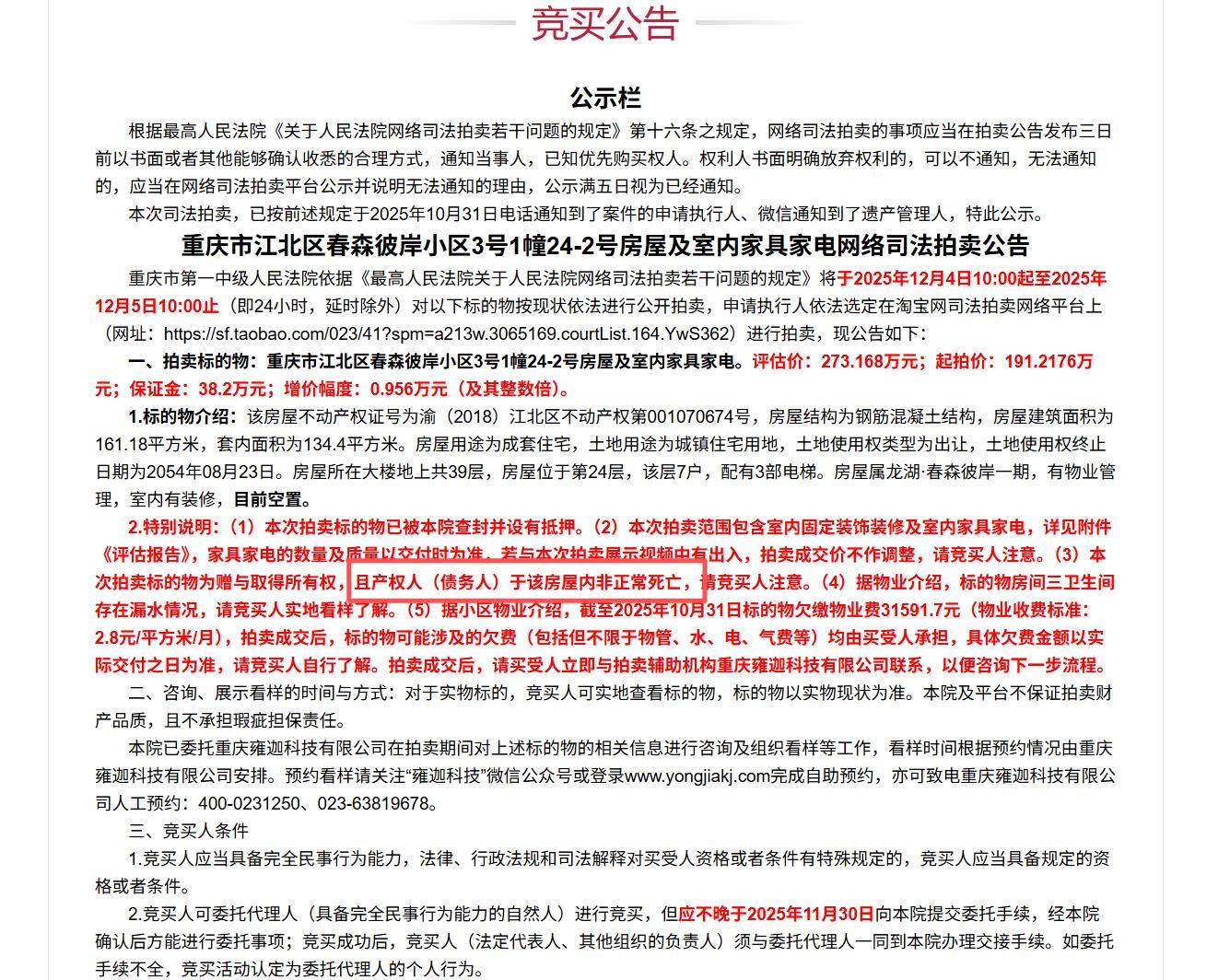 11月3日,重庆市第一中级人民法院发布了一则司法拍卖公告,位于重庆市江北区春森彼岸小区一套134平方米的房屋被司法拍卖,起拍价191万元。值得注意的是,公告里特别提示,产权人(债务人)在该房屋内非正常死亡。