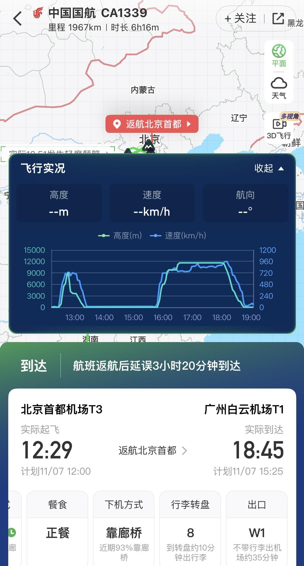 记者查询多个飞行APP显示,7日,CA1339航班计划于中午12时从北京首都机场出发,下午3时25分抵达广州白云机场。但实际起飞时间为中午12时30分,实际抵达时间为晚上6时45分。