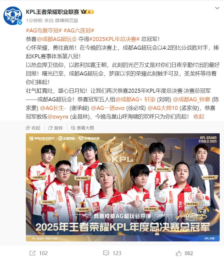 11月8日,成都AG超玩会夺得2025KPL年总决赛总冠军。