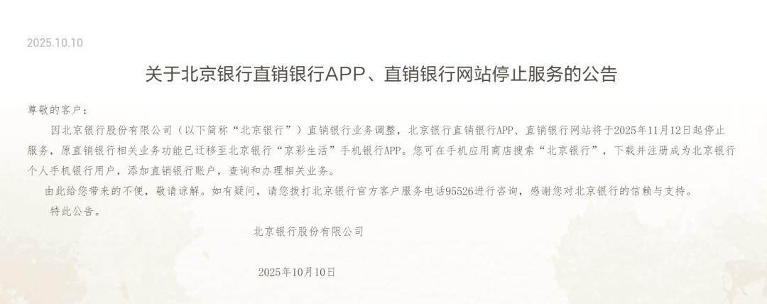 直销银行App的关停开始得更早。2023年至今,已有至少21家银行停止运营其直销银行App。据中国互联网金融协会2024年11月公告,包括民生直销银行、昆仑直销银行在内的25款金融客户端主动申请注销备案,涵盖多个细分领域。目前市场上仅存10余家直销银行App,不足巅峰期的十分之一。直销银行是一种不设立实体网点,依托互联网、移动终端等线上渠道独立运营的商业银行模式,2013年9月北京银行先行试水这种业态。而就在10月10日,北京银行公告称,其直销银行App及网站将于今年11月12日起停止服务,这也被视为直销银行的“落幕”。