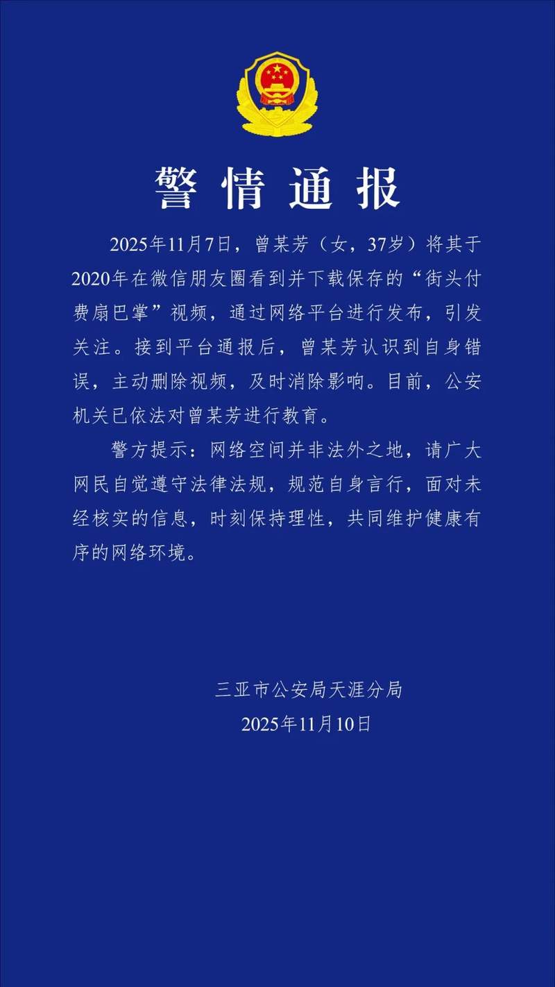11月10日,三亚市公安局天涯分局发布警情通报:2025年11月7日,曾某芳(女,37岁)将其于2020年在微信朋友圈看到并下载保存的“街头付费扇巴掌”视频,通过网络平台进行发布,引发关注。接到平台通报后,曾某芳认识到自身错误,主动删除视频,及时消除影响。目前,公安机关已依法对曾某芳进行教育。