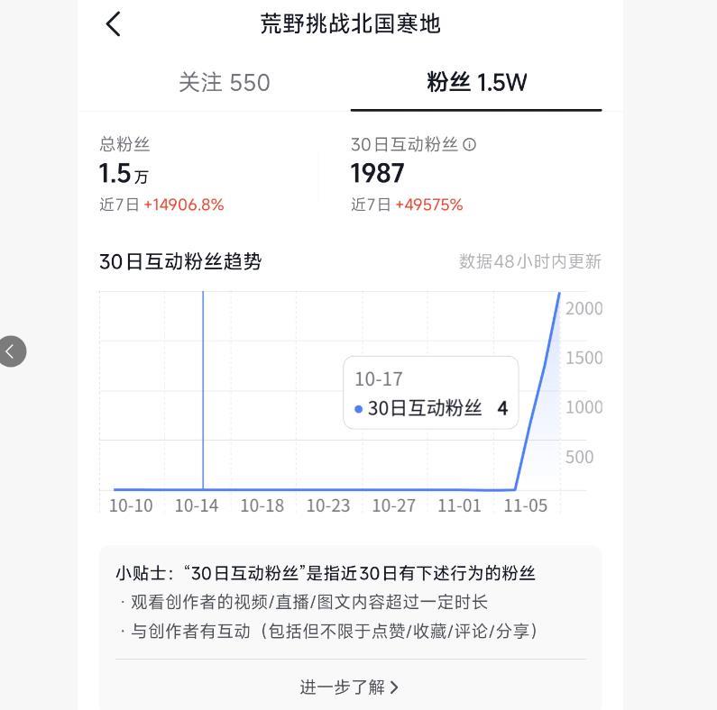 目前,该账号粉丝已增长至1.5万,数据显示,近七日其粉丝增长率达14906.8%。