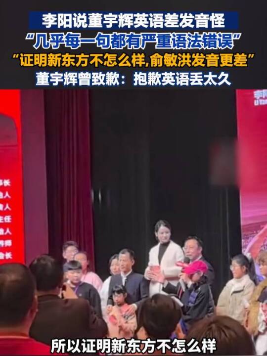 11月10日,有网友发视频,在11月8日—9日的疯狂英语线下活动中,创始人李阳表示:“昨天我听了董宇辉的演讲,跟国外的外交官交流,几乎每一句话都有严重的语法错误,而且发音特别怪,所以证明新东方不怎么样,俞敏洪发音更差,所以学口语唯有疯狂英语。这段话一定要发到网上,引起洪天巨浪,轩然大波,我就喜欢轩然大波。”